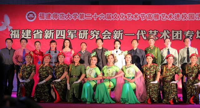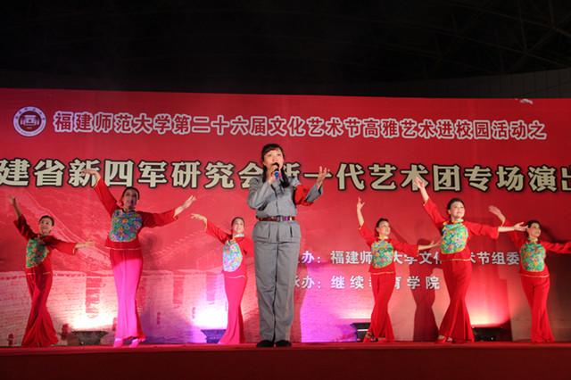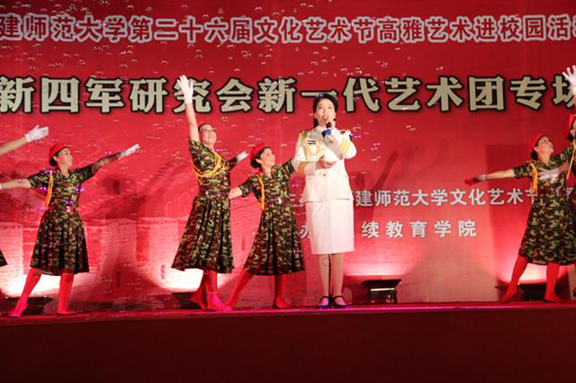 4月20日晚,由校文化艺术节组委会主办,继续教育学院承办的校第二十六届文化艺术节高雅艺术进校园活动之福建省新四军研究会新一代艺术团专场演出在仓山校区综合体育馆举行。省新四军研究会副会长王东炎、研究生工作部部长黄兴彪、继续教育学院党总支书记曾志新、地理科学学院党委副书记李建华、校团委副书记陈志勇及研究生院、地理科学学院、应用科技学院、信息技术学院、海外教育学院、继续教育学院、人民武装学院师生代表1000多人观看演出。